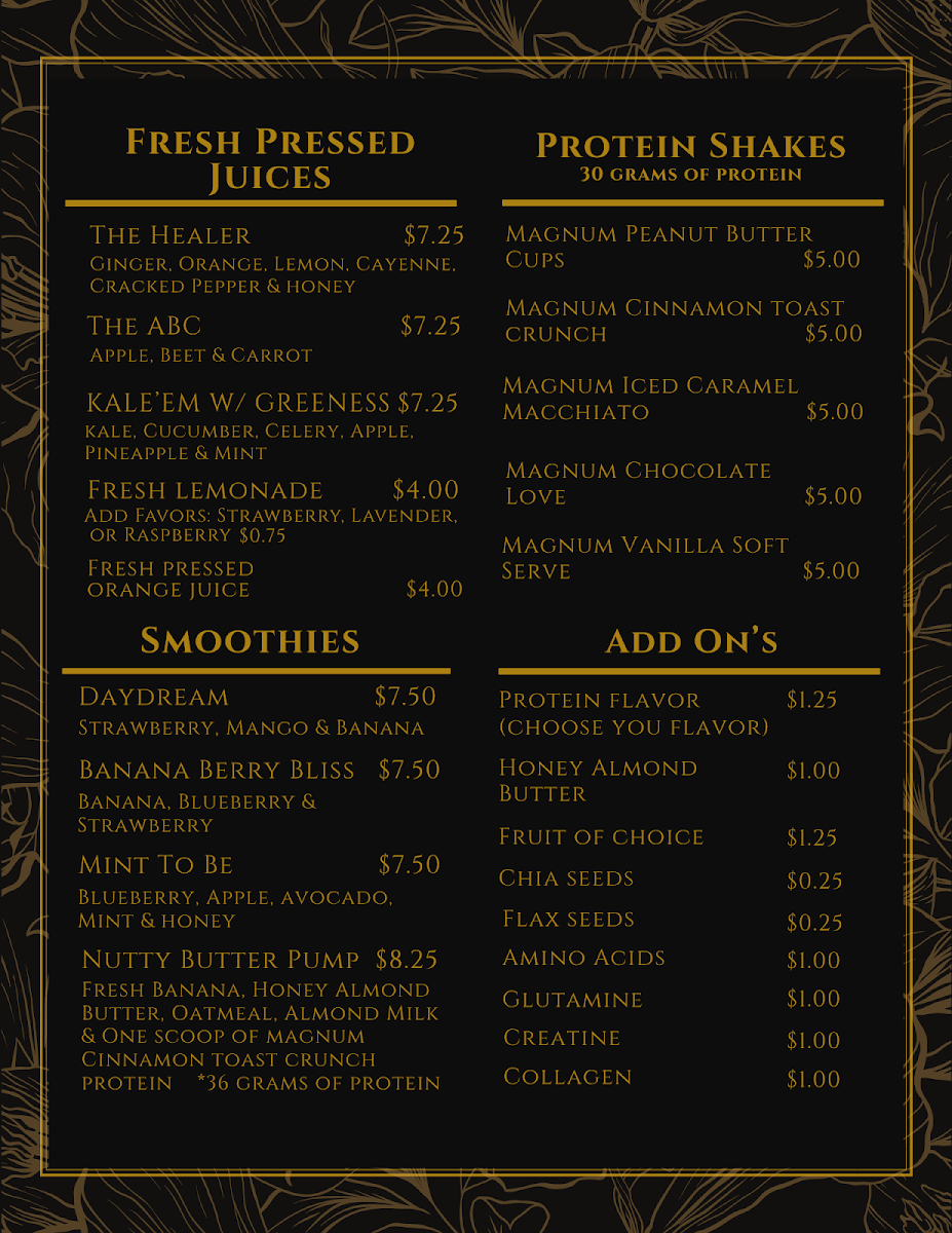 Fresh pressed oranges, lemons, ginger, cracked pepper & honey. No added preservatives or sugars.